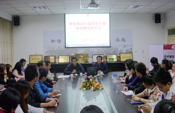10 月20日 晚,我系在一号教学楼106会议室隆重召开2011年学生干部任命暨培训大会,系主任黄元英出席本次大会并作重要讲话,辅导员赵文英、付栋、李斌、黄璜及2010级系学生干部参加了会议。大会由系党总支书记张彦民主持。