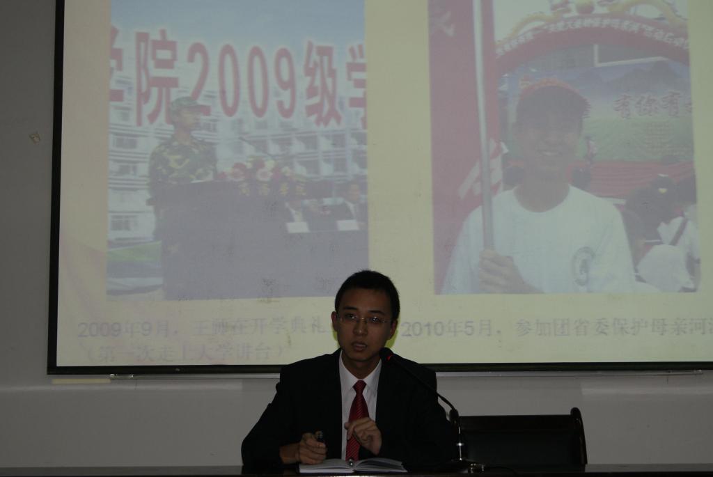 10 27 晚,中文系学生分会学习部邀请陕西高校感动校园人物 王帅,在一号楼报告厅一为我系汉语言文学和文秘教育专业新生作个人成长交流报告。本次交流会由中文系学生分会主席李军主持。