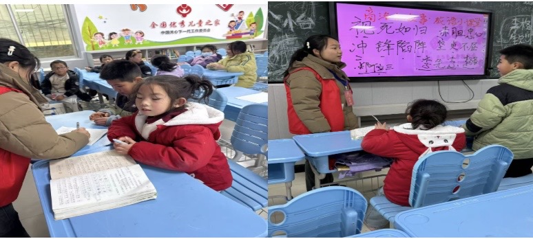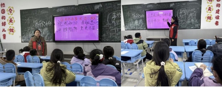 2025年12月14日,人文学院党委学生第一党支部再次组织志愿者走进东店子小学,开展“党史进校园,红色润童年”系列红色宣讲活动。本次活动在延续首场活动良好互动模式的基础上,创新采用“成语+烈士事迹”的宣讲形式,让党史故事以更生动、更贴近少年儿童认知的方式“活”起来。
